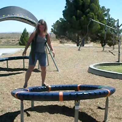 Woman tries to walk on spinning ring at playground, she loses her balance and falls over. Short heads & tails. park. Bonehead.