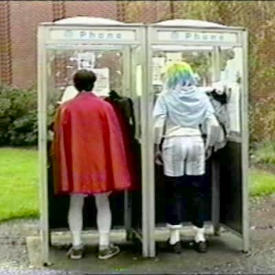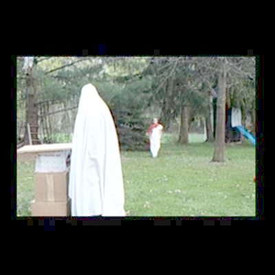 While making a home made movie/play about the murder of Julius Caesar, preteen boys and girls walk around a backyard in togas. One boy tries to ride a zip line down from a tree. He gets stuck, spins around, and falls down hard on the ground. Short tails.