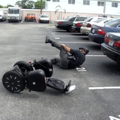 Man (police officer / cop) tries to ride Segway scooter but falls face first. He's wearing all black and a helmet.