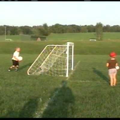 Young boy kicks a soccer ball at the back bar of a net on a field. The ball ricochets and hits him in the face, he falls down. Bounces back.
