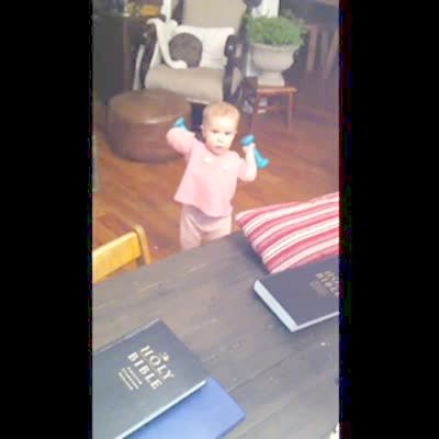 Baby girl lays on the floor with small dumbbell weights. She picks them up, stands by a table, and falls down from the weight of the dumbbells. Short tails. Exercise.