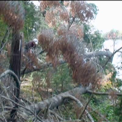 Man tries to jump from tree branch to a fallen tree trunk in the woods by a lake. He slips and hits his arms & back on the trunk, lands at the bottom of a small hill.