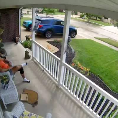 A man stands on a porch next to a barbecue grill, then a piece of aluminum foil is blown by wind off of a dish of food, and it covers his face. Security footage.