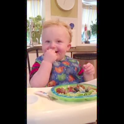 TOT GIRL IN HIGH CHAIR COVERED IN BLUEBERRY AND BLACKBERRY GUNK SINGS "I Been Workin' On The Railroad". Mess