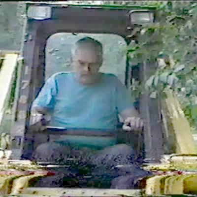 A loader machine tips forward and smokes up in a field. Security camera footage.