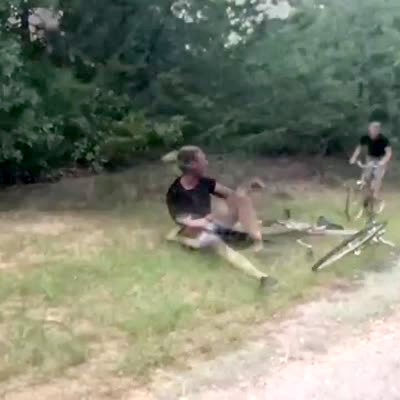 A man rides his bike up a wood ramp and falls forward on the side of a road. Replayed in slow motion.