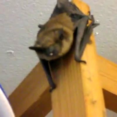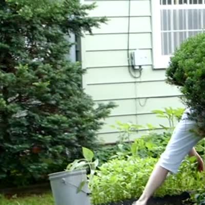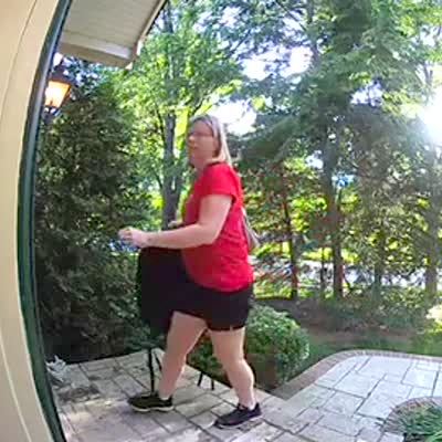 A woman walks up to the front door and a bird flies over her head, so she ducks and falls backwards off the step into the bushes.