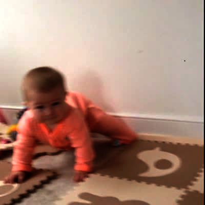 A baby girl crawls indoors and a dachshund dog pops its head up into frame in front of her.