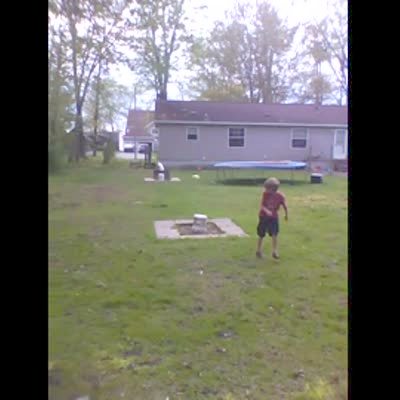 In a backyard, a young boy throws a plastic bottle bomb made by mixing water, vinegar, and baking soda in the bottle. The bomb explodes and blasts all over the boy. He screams and runs to the house.