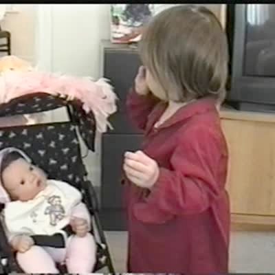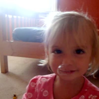 Tot girl has a big snot bubble coming out of her nose in the bedroom. Group of boys laughs at her. Gross.