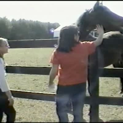 A horse sneezes and everything that comes out of its nose and mouth lands on a girl's face. Snot/ boogers/ mucus.