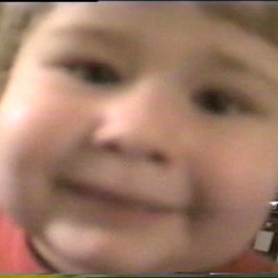 A man and his tot son wish the man's mother a happy birthday with a video and the boy picks his nose the whole time.