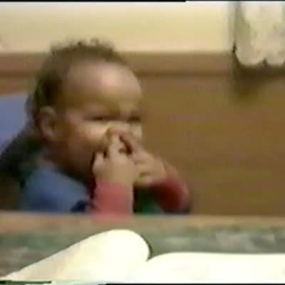 Close up of baby boy talking to woman while man in the background picks his nose and eats the boogers. Man doesn't know he's being taped. Gross.