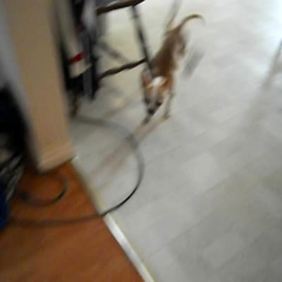 Chihuahua dog with booties on its hind legs kicks its legs up in the air while walking around living room, kicks off the doggie shoes.