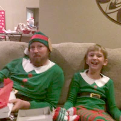 An adult man and young boy each open a Christmas present, the young boy getting a pair of baby shoes and the adult man getting a baby onesie. The adult man understands right away, but the young boy takes a minute to understand that his mom is pregnant and they are both very excited indoors.