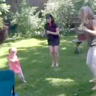 Two women and a tot girl dance to music in a yard and one of the women dances backwards with her butt and knocks the tot girl down.