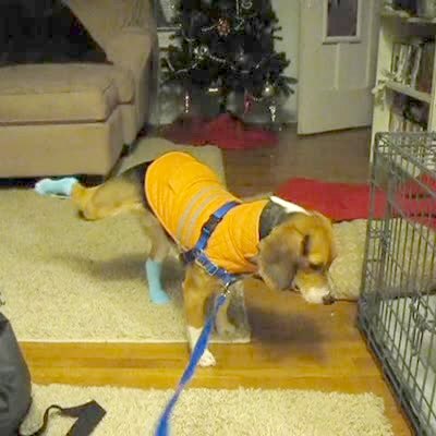 Beagle dog in an orange coat & booties looks mad while trying to walk.