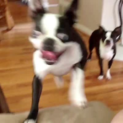 A woman and a Boston Terrier enter a house and when the woman says, "Ready, set, sploot!" the dog lies on the floor with her legs spread.