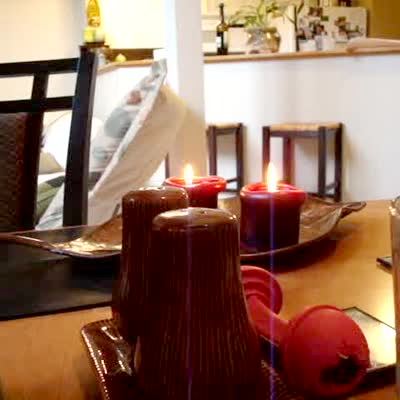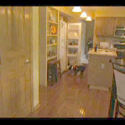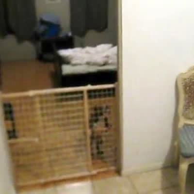 A Boston Terrier dog tries to climb on to a counter top, but slips off of a side table and the table flies into the air. Security camera footage.