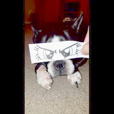 A Boston terrier dog looks angry with paper eyes in front of her face. AA: Make some paper peepers.