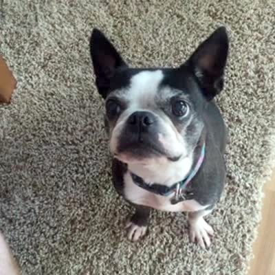 Boston Terrier dog makes weird noises / sounds in woman's arms.