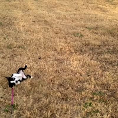 A dog leaps up and flips in the air as he tries to get to a helium-filled balloon that floats overhead.