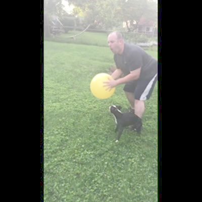 A Boston terrier dog jumps for a man's large rubber ball outdoors but misses and kicks the man in the groin in slow motion.