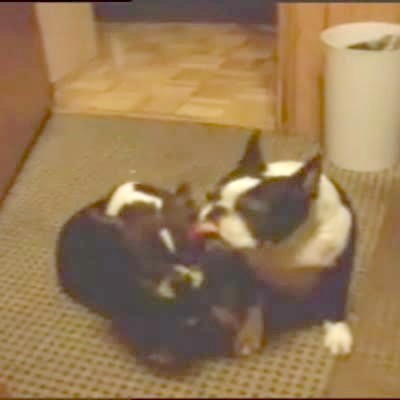"Puppy Love" Boston terrier licks another dog & when it stops, the other dog paws terrier in the head like he wants it to continue licking.