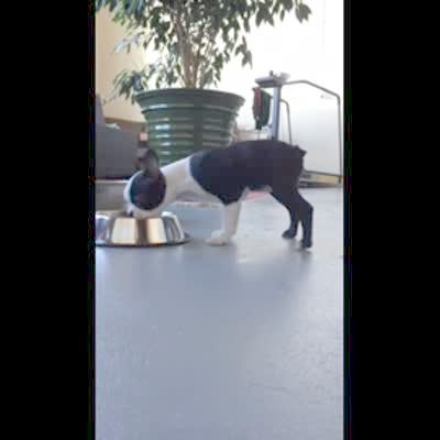 A Boston Terrier puppy dog eats from a bowl of larger dog food and barks at a boxer dog that tries to get to his food bowl that the puppy steals from.