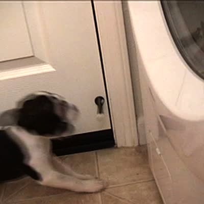 Man tells dog to go inside and get a beer. Dog gets it, then runs back and closes the refrigerator / fridge door. Pet trick.