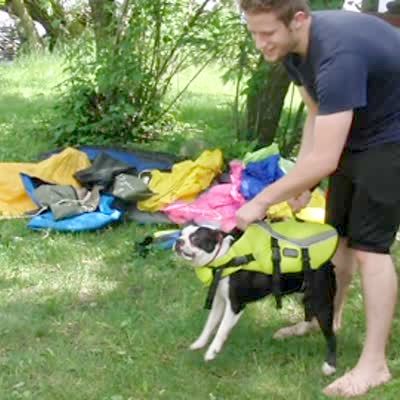 Man holds Boston terrier by a life jacket in the air in the yard. The dog wiggles and growls to be let down.
