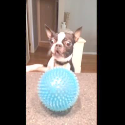 A Boston terrier dog hops up and down behind a table where his ball sits in front of the camera.