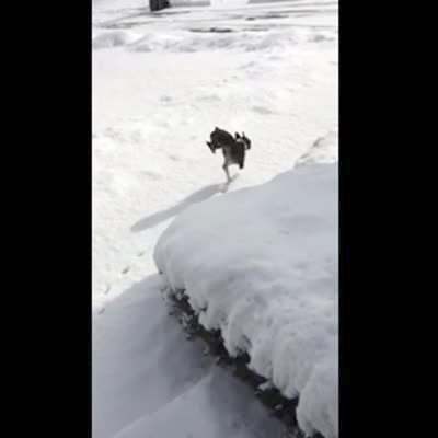 Dog gets very excited as snow is shoveled at him, does somersaults.
