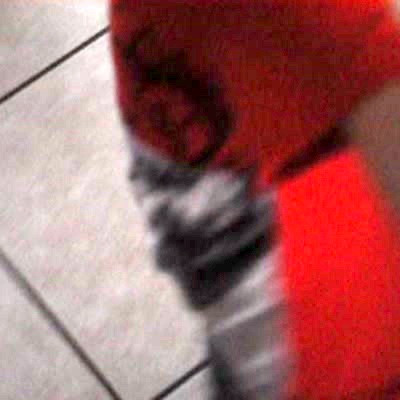 Boston Terrier dog sits upright like a human on the kitchen rug & sways back & forth, scratching an itch on its butt. Looks like it's dancing.