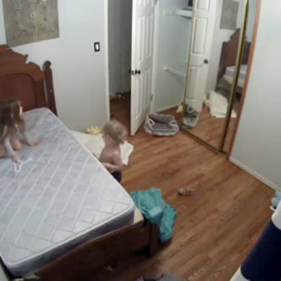 A young girl and tot boy play in a bedroom and a man sticks his head in the doorway and the boy closes the door on his head. Nest home security camera