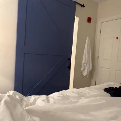 A teen boy walks through a doorway before a rigged water bottle falls off the doorframe and hits him on the head as he falls onto the bed.