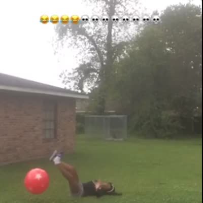 A teen girl jumps onto a bouncy ball and falls backwards onto the ground.
