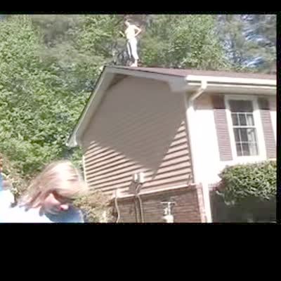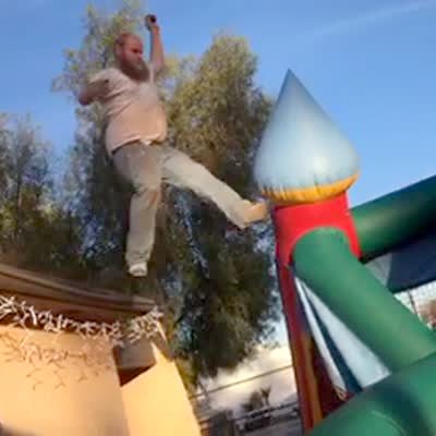 A man jumps from a roof onto a deflating bouncy house. The young boy on the bounce house falls to the ground.
