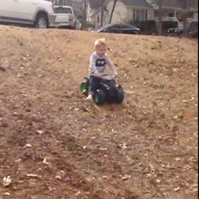A tot boy rides a toy four wheeler down a hill outdoors and crashes into an inflated bouncy castle house.