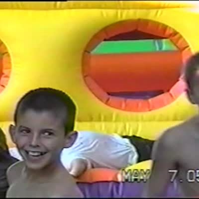 A woman does a front flip in bouncy house and her wig flies off. Featured talent cleared ONLY (woman whose wig falls off. No releases for the children).