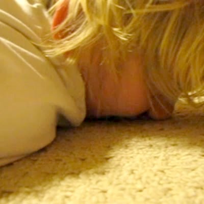 "Put A Sock In It" Baby girl stands on mom's stomach, gets her sock caught in mom's braces as mom lays on the floor. Woman laughs with sock in her mouth.