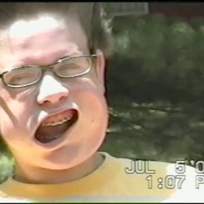Boy with glasses and braces looks funny when he uses a leaf blower on his face.