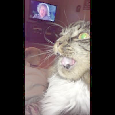 "Brain Freeze Feline" A cat licks ice cream and opens his mouth upset from brain freeze.