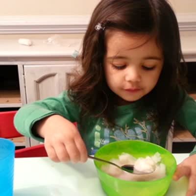 A tot girl eats ice cream indoors and her arms stiffen up as she makes a funny face from brain freeze.