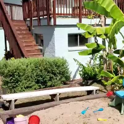 A man with the camera in a yard tries to get a woman to go down the slide. The woman tells the man to go. Around 0:35 he gives her the camera and he slides down the slide and it breaks and he falls out the bottom of it.