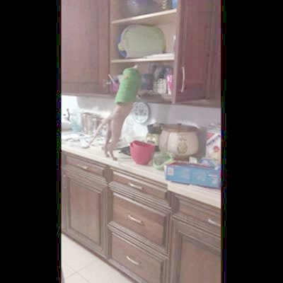 A cat breaks at ceramic bowl when they pull it out of a kitchen cabinet and it falls on the floor.