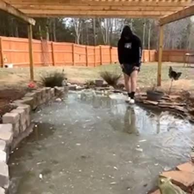 A man runs over a frozen pond of ice and it breaks. His legs fall in the pond as he runs out.