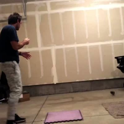 A man practices his golf swing in a garage and the club slips out of his hand and bounces off the wall and breaks.