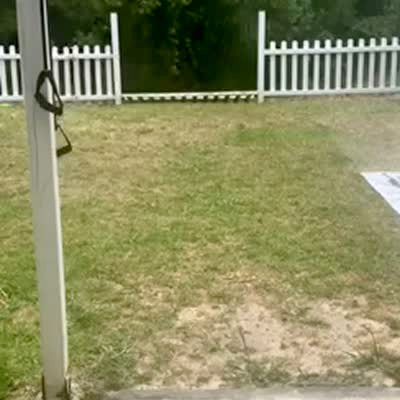 A woman tries to secure a patio umbrella in the wind ahead of an upcoming storm. But then a gust of wind knocks over the table and when the woman pulls out the umbrella, the pole breaks the glass tabletop. A young boy yells for her to come inside and a dog barks in the house. Security footage.