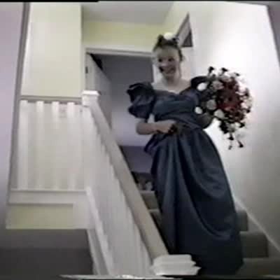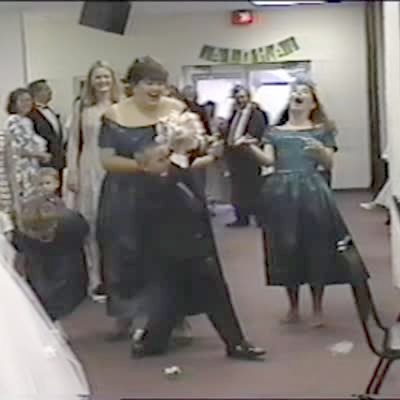 A groom dips the bride when they kiss at their wedding and he loses balance and drops her.